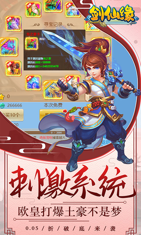 《剑仙缘(0.05折满星宠物)》是一款Q版回合制游戏。创角即送VIP10、仙玉*8888、元宝*1000000、银两*1亿!累计登录还有满星宠物等你拿!精美2DQ版人物设计,搭配西游故事剧情,实力打造精品回合制经典!酷炫坐骑共同遨游天宫,独有万千道具自由回收,多样经典回合玩法无穷乐趣!