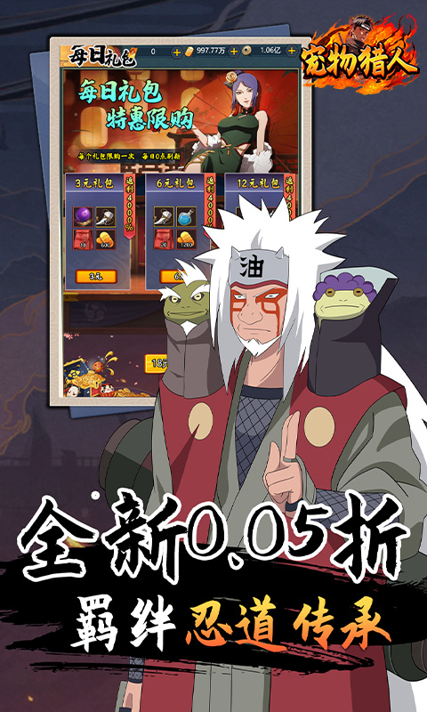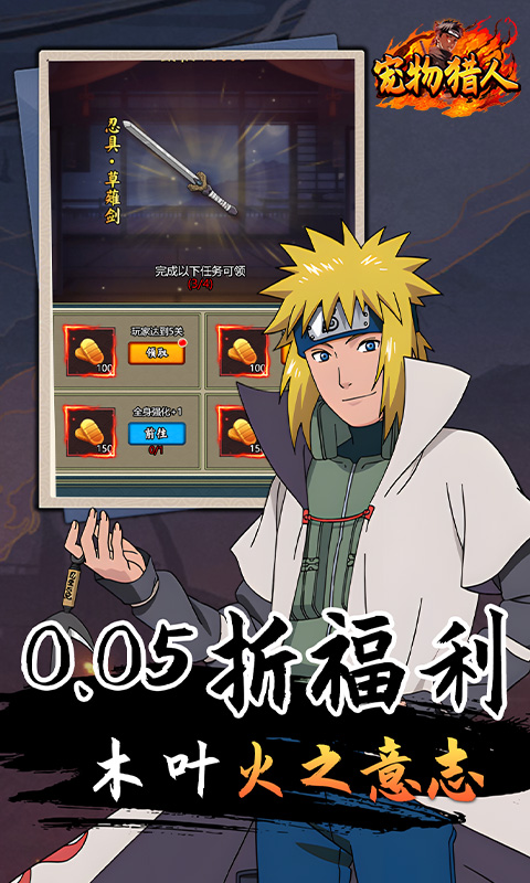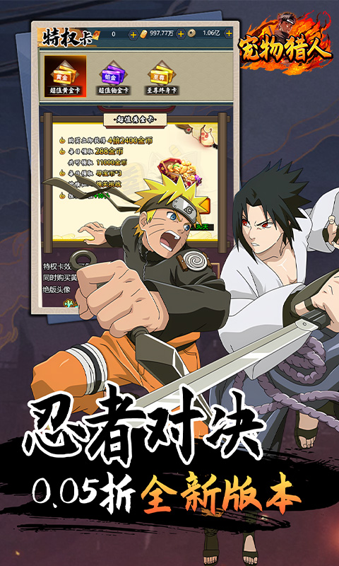 《宠物猎人(0.05折忍者对决)》是一款动漫题材,有着创意背景、百种BOSS、各路忍者和独特战斗体系的卡牌对战手游。其中引人入胜的剧情、自由探索的地图,还有武器打造、提升兵将实力布阵对战,让玩家们在忍者组织之中闯出一番伟业。