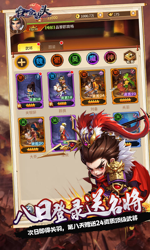 这是一款轻松休闲的卡牌策略手游。游戏采用萌系画风与创新挂机玩法,让您摆脱繁琐操作,专注排兵布阵,体验运筹帷幄的乐趣。每日任务更有福利放送!指尖轻点即可收集三国名将,组建专属阵容,享受轻松养成与策略博弈并存的独特体验。