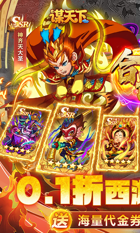 每日签到领千元代金券0.1折西游回合卡牌《谋天下(0.1折少西代金直充)》,西游少年开天辟地,称霸三界。上线即送至尊满V特权、解锁超多功能,每日签到再领万元真充卡、千抽抽卡令、海量代金券,更有疯狂商城永久激活元宝、银币、经验等等,英雄、宝物、装备海量兑换,零氪也能集齐三界神仙,爽玩西游世界!