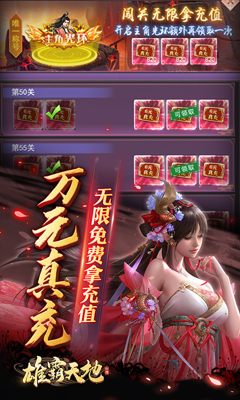 《雄霸天地(0.1折万元真充免费版)》是一款以西游为背景的暗黑风格写实类的ARPG产品,游戏中给玩家创造出一个带有独特风格的西游世界、在游戏过程中,更有精彩的技能与合击、海量装备、炫酷坐骑与时装、跨服GVG对战。体验与西游中的角色们一起成长,重踏西游之路!